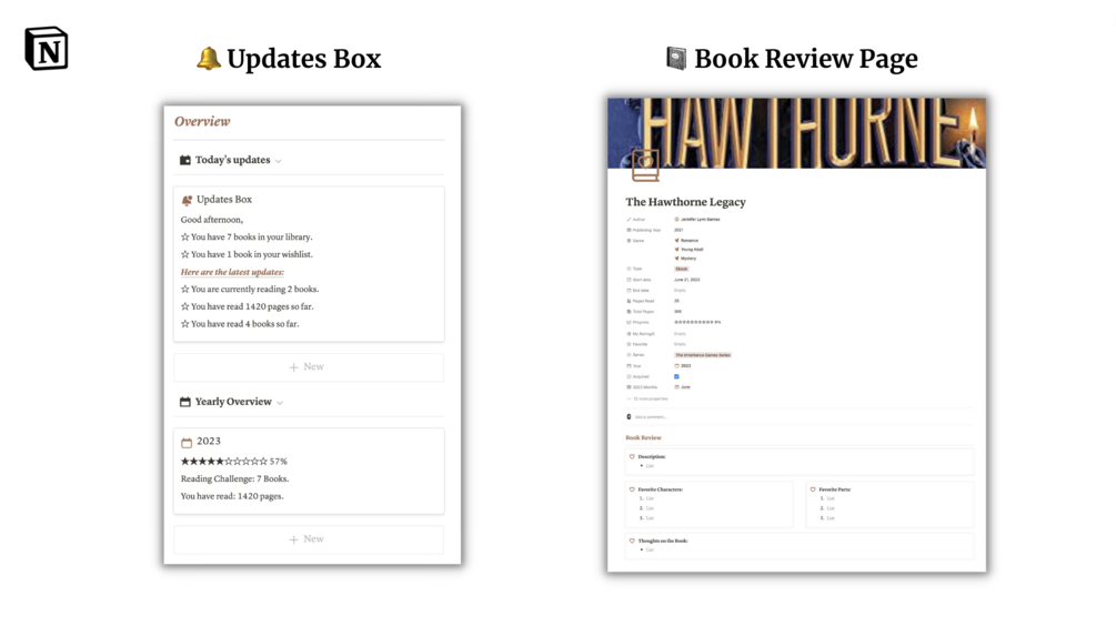 Stay up-to-date with the new "Updates Box" Feature, automatically tracking the number of pages read, books in your library, and wishlist, all at a glance.