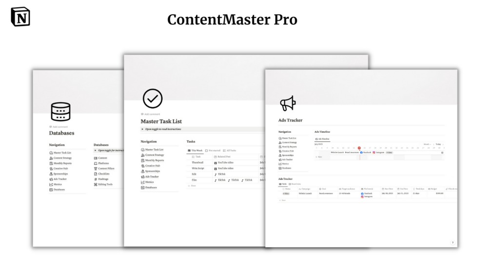 ContentMaster Pro is a comprehensive Notion-based system designed to empower small businesses, content creators, and social media managers in optimizing their social media presence.